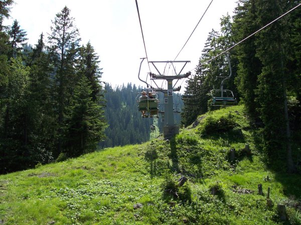 Almkopfbahn svævebanen (på den blide del af strækningen) på Heiterwanger Hochalm i Østrig. 1622 meter høj.