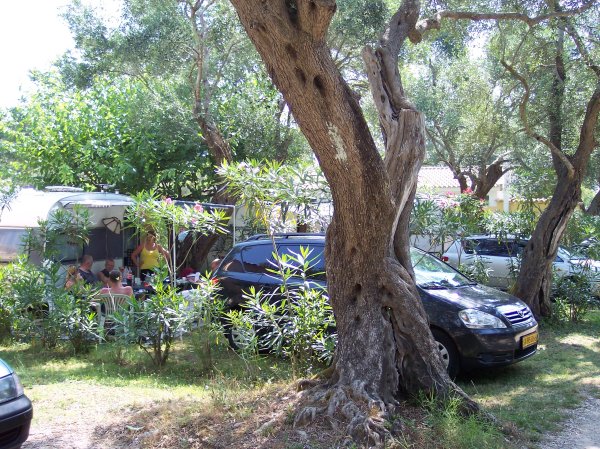 Kirsten og Johns plads forrest og vores ved siden af til højre på Karda Beach Camping, Dassia på Korfu.
