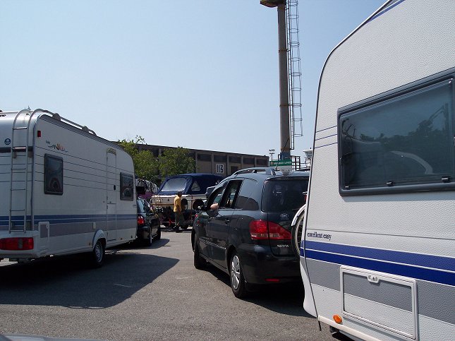 11. juli, kl. 11.11: Holder i kø for at tjekke ind til færgen, Venedig.