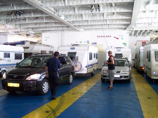 11. juli, kl. 12: Ombord på campingdækket på Ikarus Palace fra Minoan lines. Kirsten og Johns bil og campingvogn til venstre og vores til højre.