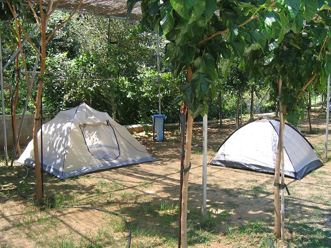 14. juli: Anne og Christoffers telt i baggrunden og deres bagagetelt forrest, de