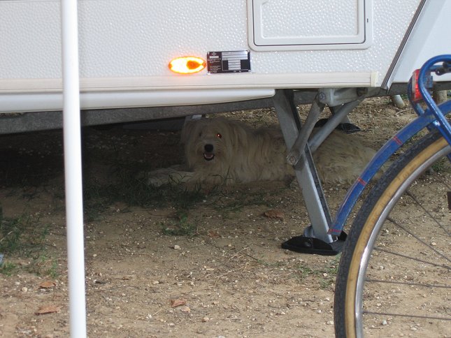 19. juli: 'Korali' under vores campingvogn - om aftenen - sidste gang den kom til os på pladsen.