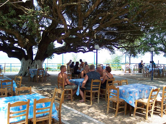 26. juli: På restauranten under det 1000 år gamle oliventræ - Camping Kato Alissos.