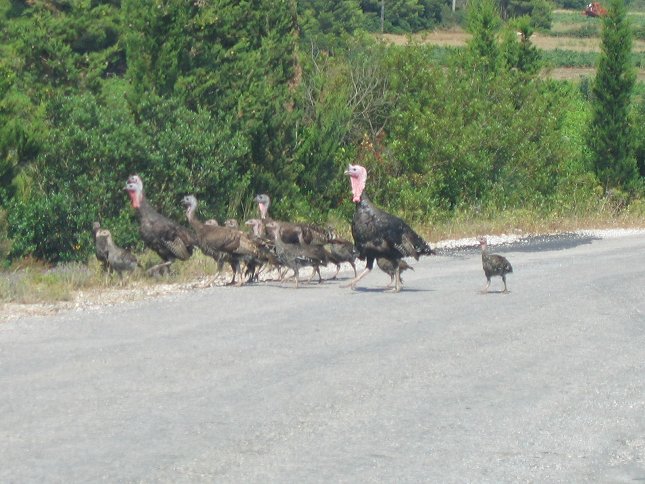 16. juli: Holder stille - en flok kalkuner passerer vejen.