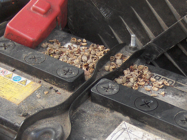 Inden vi kørte opdagede John, at han havde haft gæster under motorhjelmen. Der lå nøddeskaller: