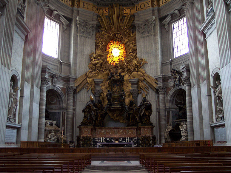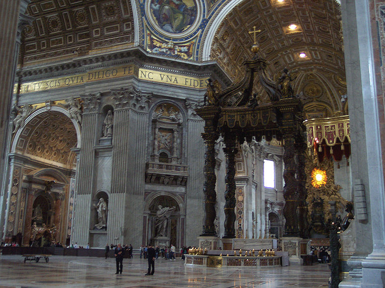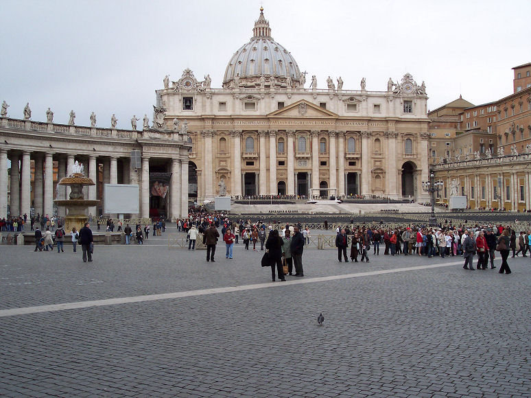 Derefter kørte vi ind til Peters Kirken. Der var en meget lang kø for at komme ind i kirken, men det tog ikke ret lang tid om at komme til indgangen. Man skal gå gennem en metaldetektor og tasker skal også køres gennem en metaldetektor, før man får lov til at komme ind på kirkens område. Da vi var kommet til indgangen af kirken, stillede vi os op i en kø sammen med et hav af mennesker. Vi troede, at det var den eneste måde at komme ind i kirken på. Efter en halv times tid og kun ca. halvvejs i køen, gik vi ud af køen igen, da det gik op for os, at vi vist stod i kø for at komme op i kuplen. Vi gik en tur ned i kælderen til pavegravene. Og derefter fandt vi ud af, at man kan gå lige ind i selve kirken uden at stå i kø - og helt gratis.