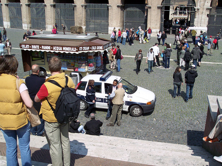 Der er mange sælgere rundt om Colloseum, blandt andet sælgere af kopi-solbriller. Vi så en civil politibetjent anholde en sælger og konfiskere hans solbriller. En anden sælger stod og gemte sig bag nogle buske imens.