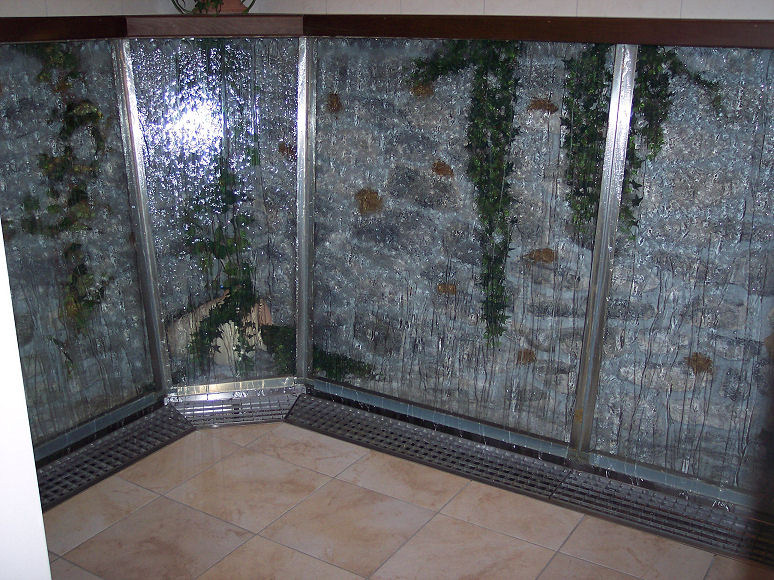Sådan kan et pissoir også se ud; vand der løber ned af en glasvæg og med planter bag glasset: