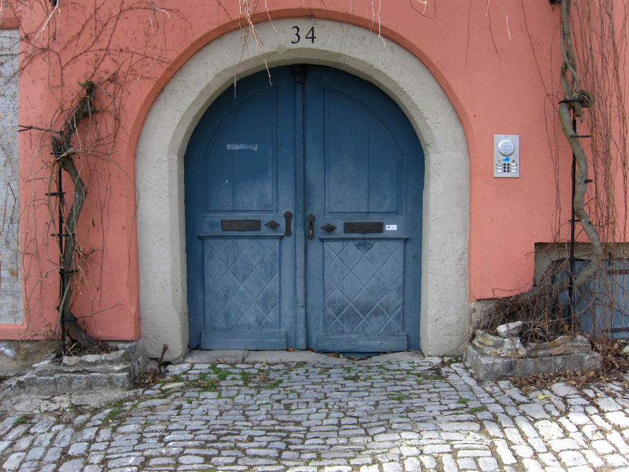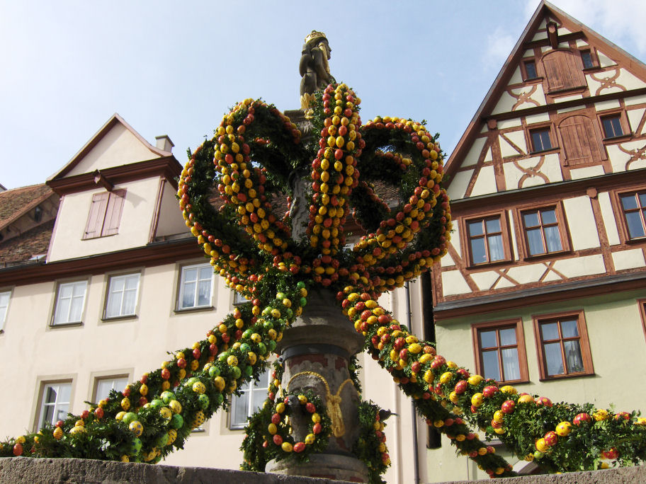 Ankomst omkring middagstid til Camping Romantische strasse, Creglingen-Münster, side 394 i Camping Cheque bogen. Der er påskeæg på mange buske og træer, det er langfredag i dag.