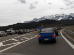 Holder i køen til højre, for at komme væk fra en stillestående 2½ km lang kø til venstre. Vi skulle egentligt have været gennem bjerget i køen til venstre, men ifølge trafikoplysningerne på TomTom, var køen 2½ km lang og køen havde været der i meget lang tid, så vi kørte fra, da muligheden var der - i sidste øjeblik.