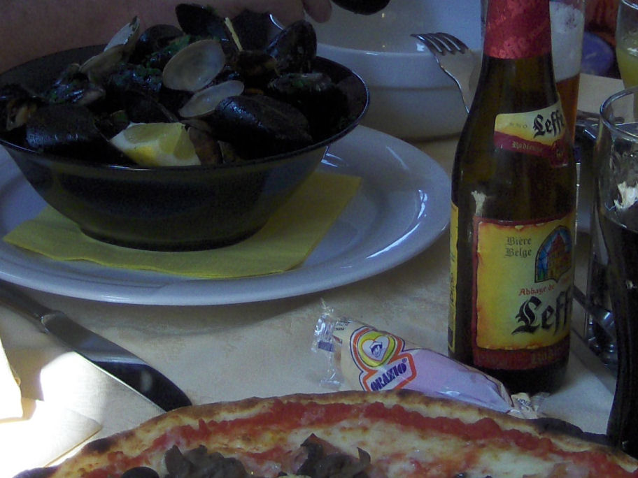 Vi kørte til en by i nærheden og spiste pizza og muslinger