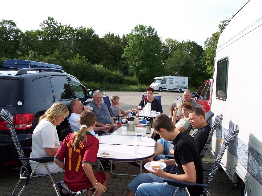 Vi forlader Rothenburg ob der Tauber kl. 11.35. Vi vil køre til 'Camping Hopfen am see' i Hopfensee. Undervejs dertil kommer vi på et tidspunkt til at holde i kø i 40 minutter pga. vejarbejde. Vi holder ind på rastepladsen i Lonetal og får frokost.