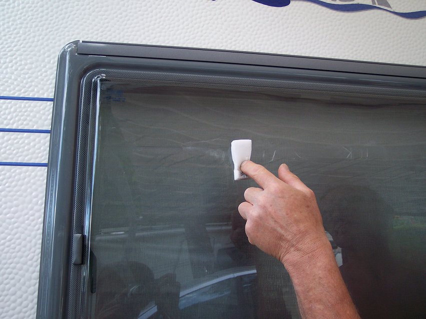 I går på vej hertil var der en postbil, der havde fuld stop, der kørte ud - lige imod os, uden at tage farten af - og snittede en rude i campingvognen, sikke en klovn, men heldigvis gik det ikke værre end det gjorde, og det kan man jo kun være glad for! Kresten bruger en viskesvamp fra Aldi (se billedet til højre herunder) i et forsøg på at polere mærkerne fra postbilen væk, det lykkedes meget godt: