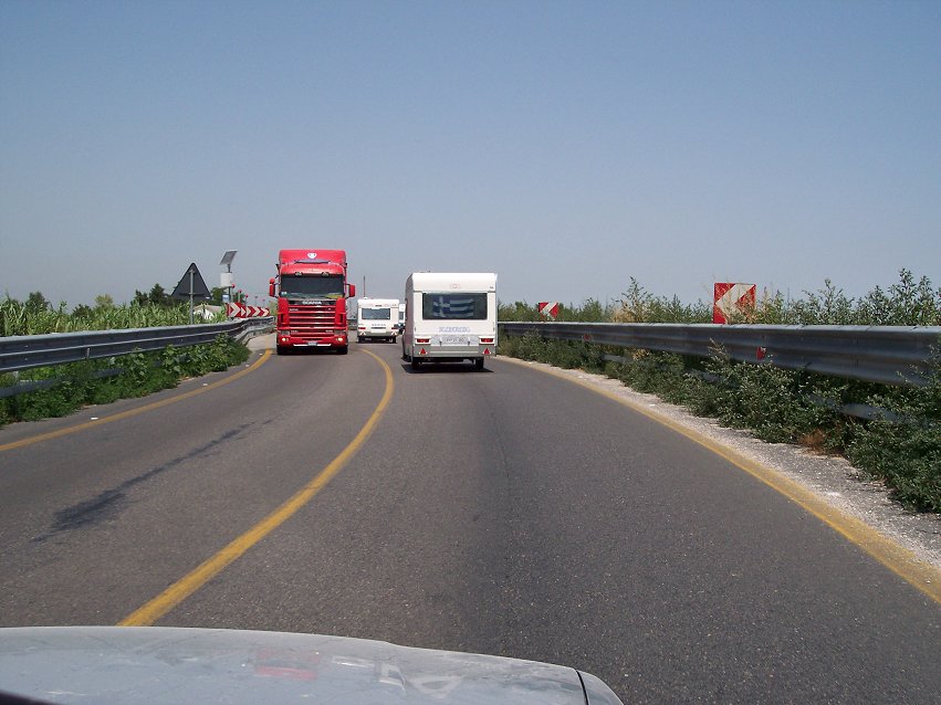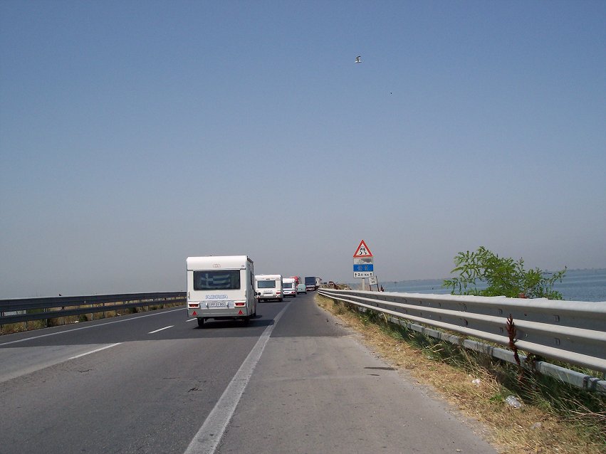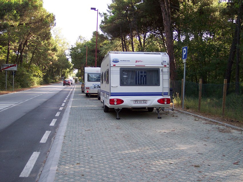 Om aftenen omkring spisetid holdt vi ind i et skovområde, hvor vi spiste. De fleste af os fik rigtig mange myggestik på den korte tid, vi var der. Bagefter ville nogle af os en tur i vandet; stranden lå tæt på. Campingvognene havde vi inden da placeret på en parkeringsplads langs med vejen, se billederne herunder. Der blev kigget under motorhjælmene - der var igen gået en kilerem og mændene opdagede årsagen til, at den var ved at springe igen: der var et spor for meget i remmen! Vi var nødt til at blive på stedet til næste morgen, hvor mændene så kunne finde et værksted og få købt en ny rem. Inden vi gik til ro, kom der er politipatrulje forbi. De ville høre, hvorfor vi holdt der. Da de hørte, at vi skulle have en reservedel på et værksted næste morgen, fik vi en skriftlig tilladelse til at blive på stedet, så vi kunne altså blive der helt lovligt.