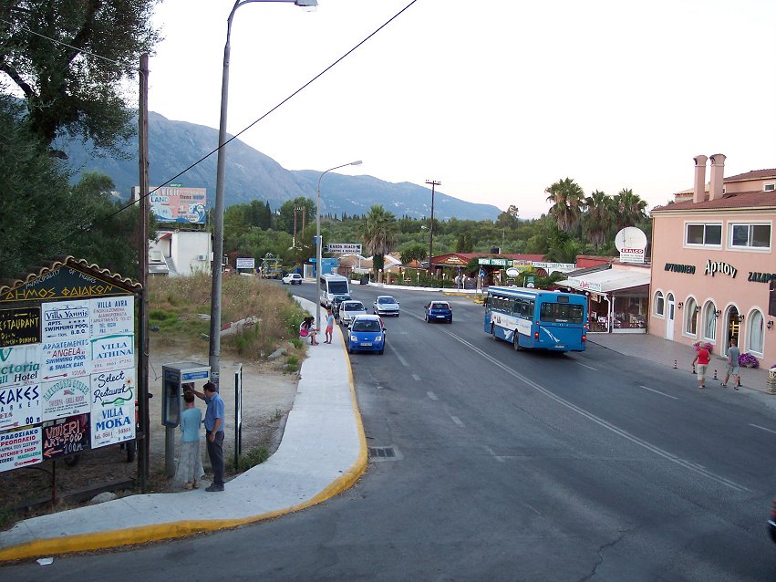 Udsigt fra Restaurant Grill House til Camping Karda Beach, Restaurant Corfiota og busholdeplads til venstre.