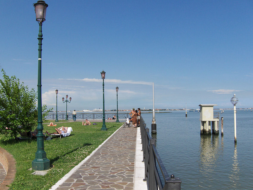 Vi ankommer til Camping Fusina før dæmningen i Venedig - omkring ved 14 tiden. Vi har tidligere været på denne plads og da vi bliver spurgt, om vi vil være på en rolig del af pladsen eller et sted med mere liv, beder vi om at være på den mere livlige del af pladsen. Selvom vi ikke selv synes, vi støjer, så er vi jo mange afsted. Da vi tjekker ind, køber vi samtidig med en billet til en turistbåd, der sejler ind til Venedig.