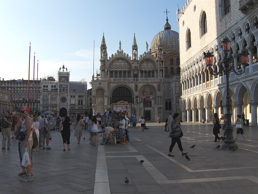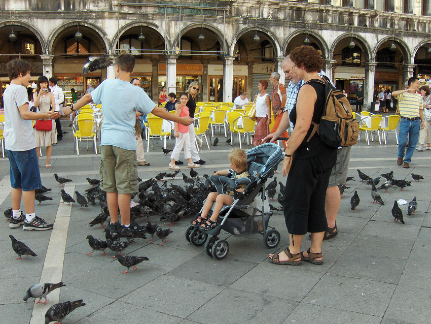 Markuspladsen: Selvom det nu er forbudt at fodre duerne på Markuspladsen, så bliver der fodret alligevel, men vi så dog ingen sælgere af foder til duerne.