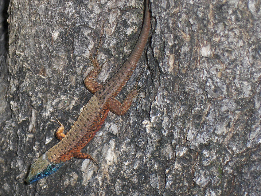 Blåhovedet firben i et oliventræ på Camilla, Kristian og Kristoffers plads: Der var rigtig mange firben med blå hoveder i dette træ.