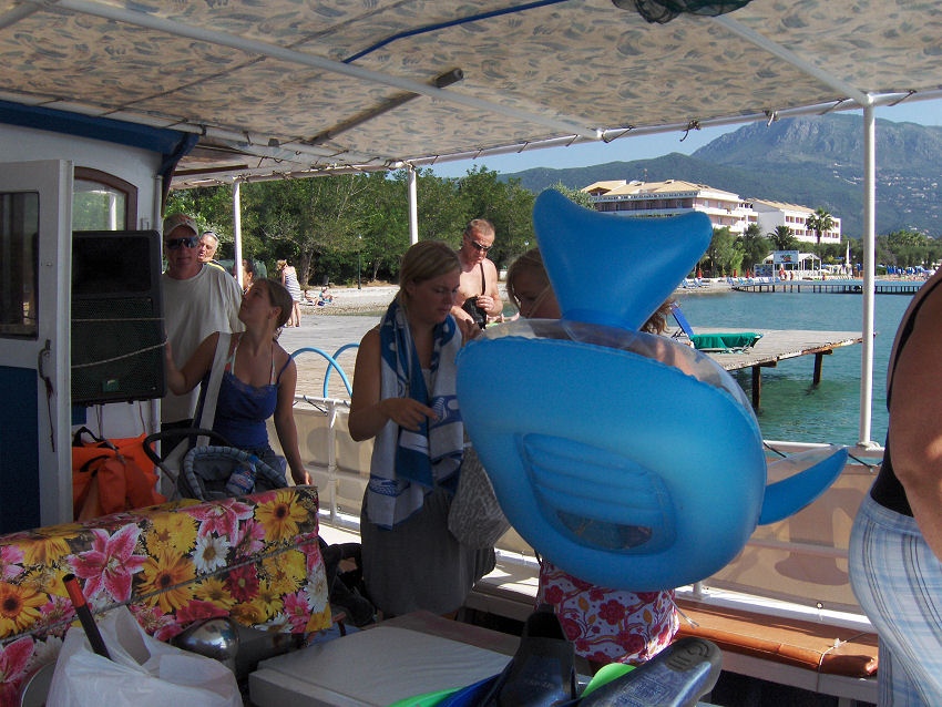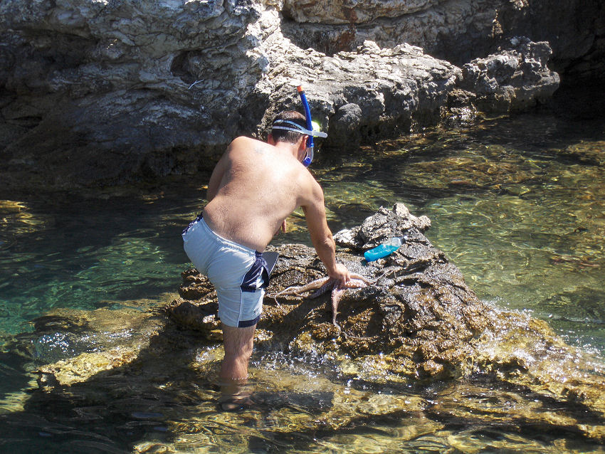 Vores skipper vil forsøge at fange en blæksprutte og hælder noget blåt i vandet, så blæksprutten ikke kan se noget, det gør det lettere at fange den. Det lykkedes også. Bagefter blev den slået mange gange ned i stenen. Vi har set det før og tror, at det gøres for at mørne kødet. Da vi havde spist og skulle sejle videre, kunne ankeret ikke trækkes op, det havde sat sig fast i en sten. Linen blev kappet og vores skipper dykkede ned for at trække ankeret fri igen.
