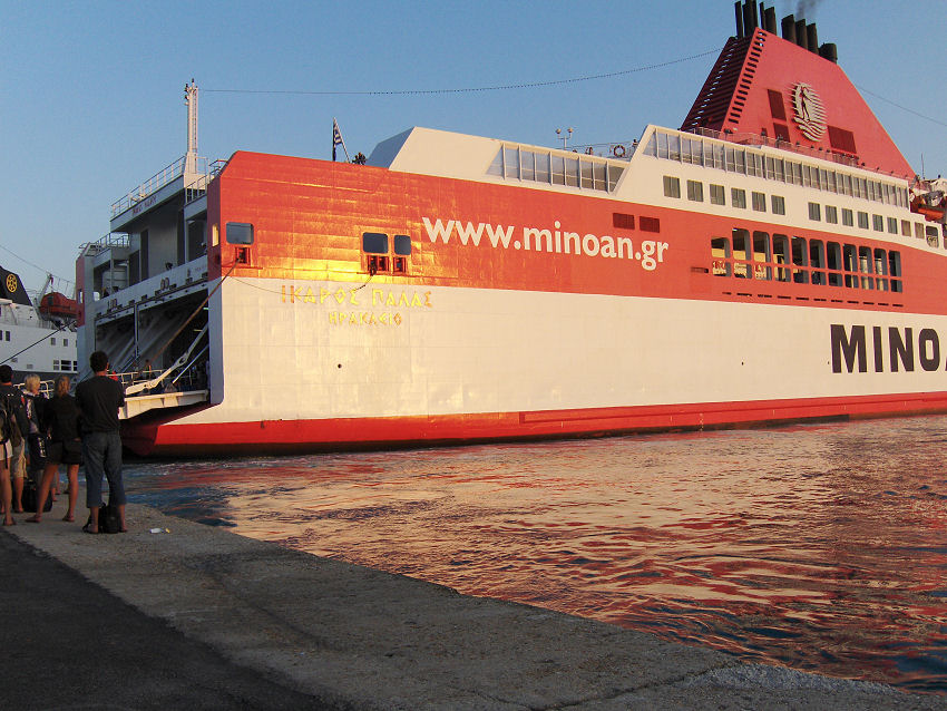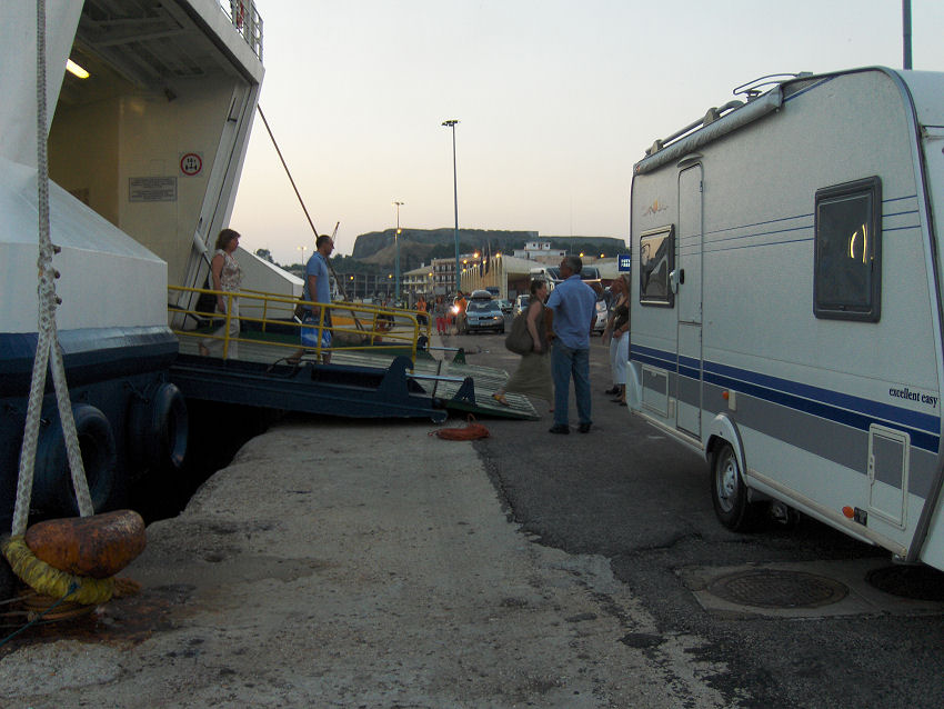 Ved 6.30 tiden lægger der en stor færge til kajen, hvor vores campingvogn står. Der var ingen rampe på stedet, så vi havde ikke forestillet os, at vi kunne være i vejen for nogen. Vi fik dog lov til at blive holdende. Det var nu heller ikke let at komme hverken frem eller tilbage, for der holdt mange, der skulle med færgerne.