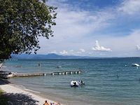 Der er en flot udsigt fra pladsen, næsten flottere, end den man har på østsiden af søen. Vores pladser ligger mod søen, med der er vel omkring 3 meter ned. Se de sidste to billeder herover. Det er ikke ligefrem egnet for små børn.
