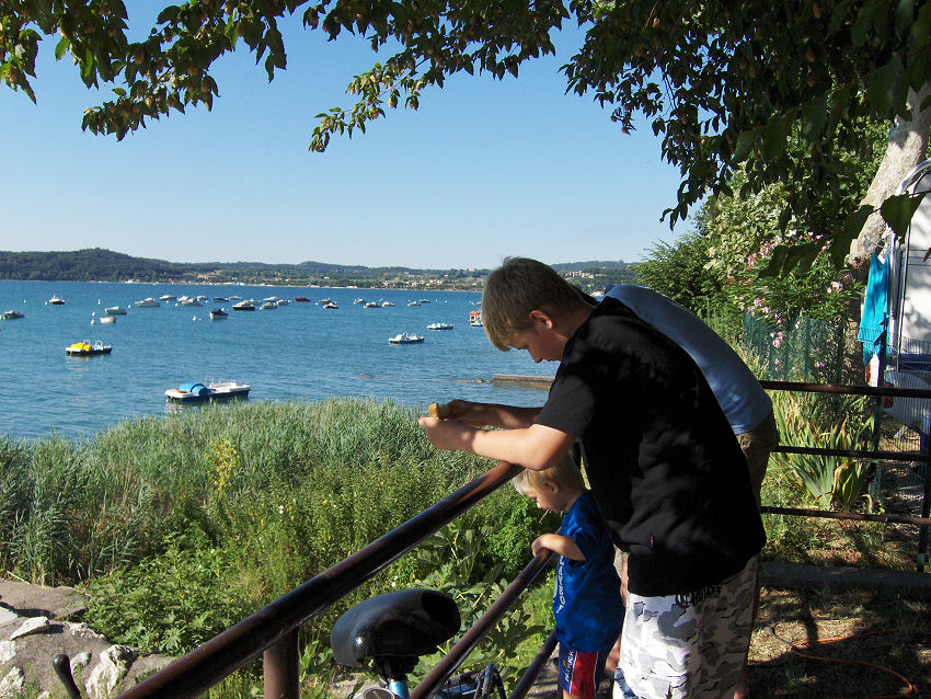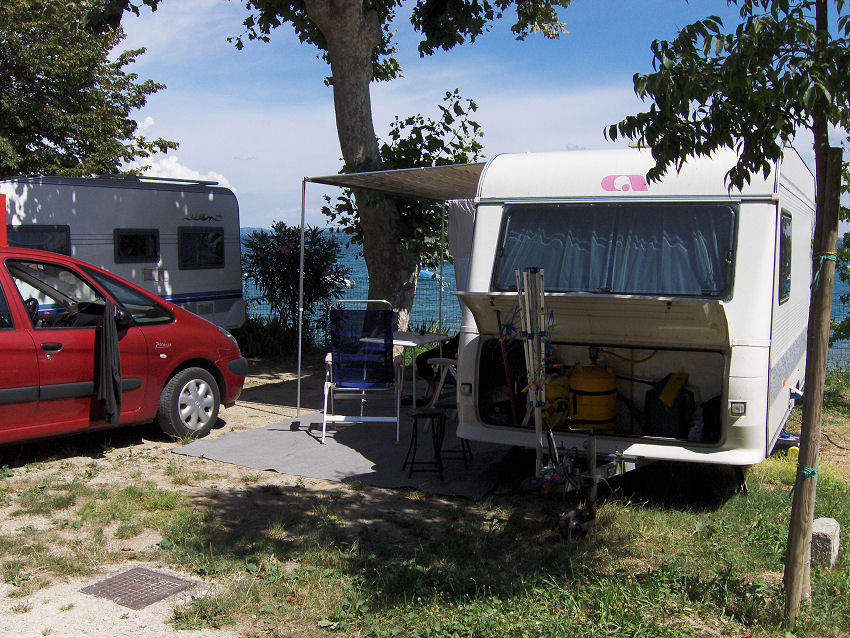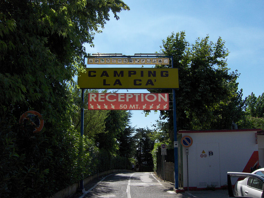 Vi kører først til det store Auchan varehus i Verona og derefter kører vi mod Camping La Ca, der ligger på sydvest-siden af Gardasøen. Kirsten og John har bestilt pladser til os hjemmefra. Det var umuligt at booke os ind på en campingplads på øst-siden af søen. Da vi kommer ind på pladsen, skal vi køre ned at den mest stejle bakke, vi nogensinde har kørt på, men ned kan man jo altid komme. Campingpladsen er bestemt ikke egnet for ganghandicappede, hvis man vil gå op til restauranten og swimmingpoolen!