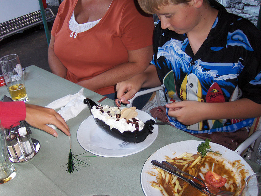Om aftenen tog vi ind i byen i Prutz for at spise på en restaurant med udendørs servering, det var den hurtigste servering, vi har fået under hele turen. Kristoffer bestilte en Banana Split til dessert og sjovt nok, blev den serveret i en gondol.