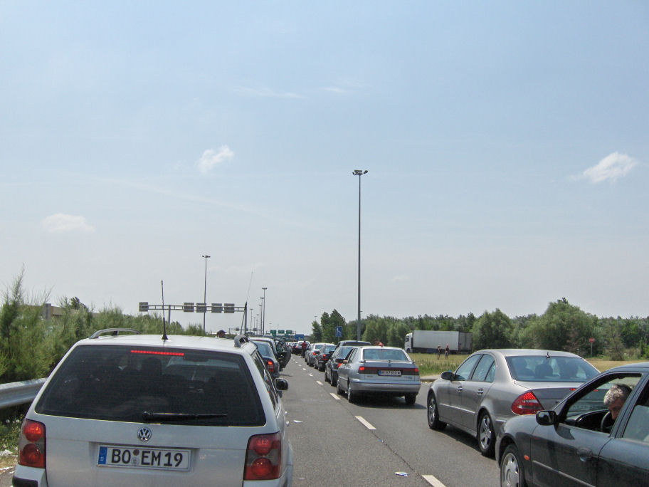 Kl. 12.20 kom vi til grænsen Ungarn/Serbien. Vi holdt i kø for at komme ud af Ungarn og sad og ventede i en lang kø for at komme ind i Serbien.