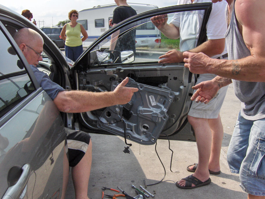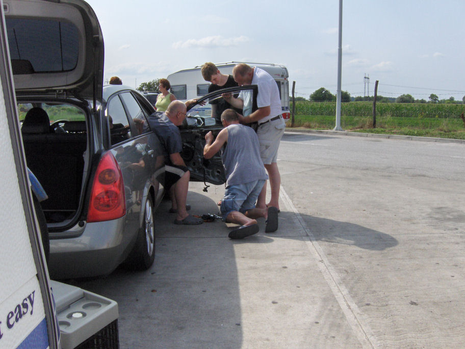 Klokken blev 15.15, før vi kom gennem grænsen ind i Serbien! 3 timer i bagende sol. Noget af tiden havde vi aircondition slået til, og da jeg på et tidspunkt ville åbne vinduet lidt for at tage et billede, sagde det BANG! Det var vinduet, der røg ned med et brag. Jeg tror, at det er de tjekkiske veje, der har rystet noget løst i døren. Vi kørte ind på den første rasteplads efter grænsen, Kresten skilte døren ad, men måtte opgive. Så indtil videre er mit vindue lukket permanent, med en skruetrækker stukket fast under vinduet for at holde det på plads og døren kan ikke åbnes.