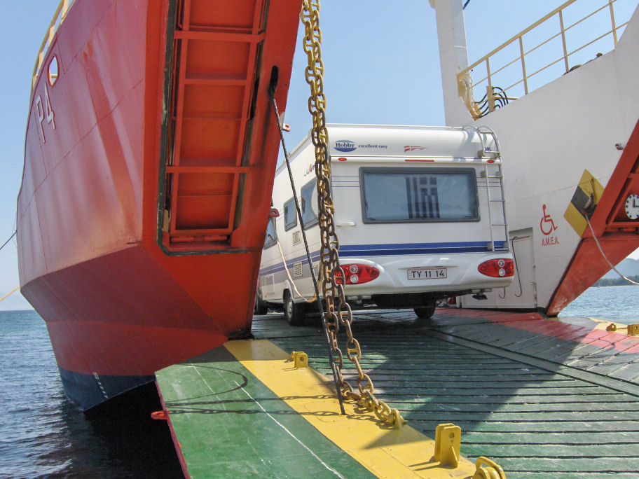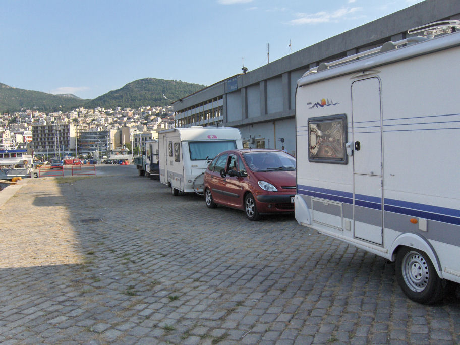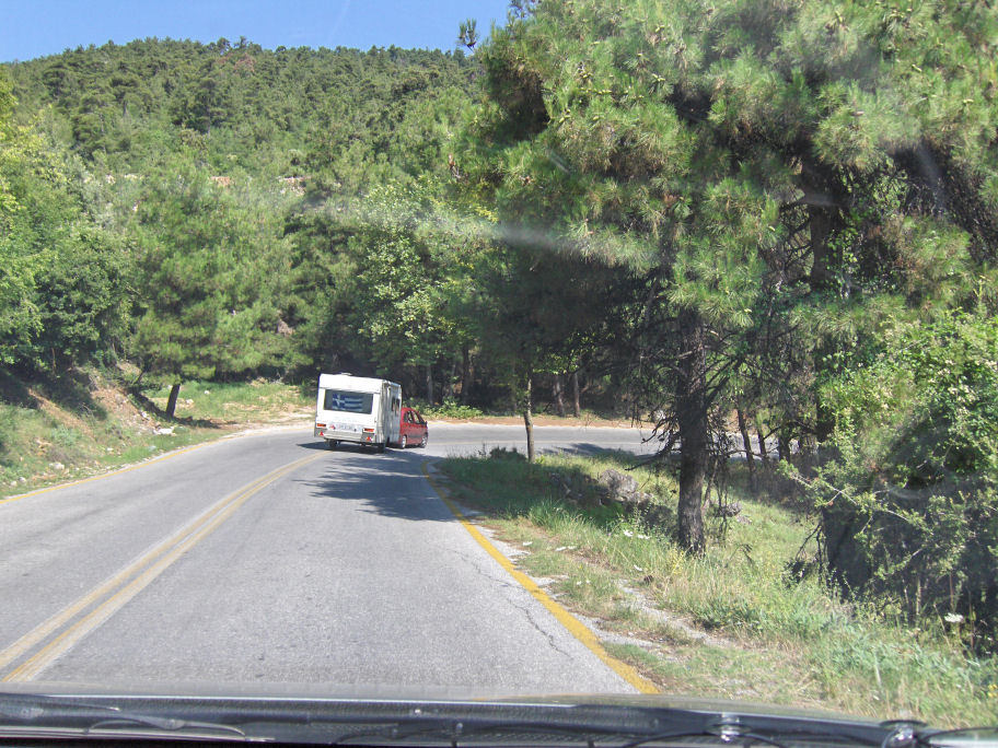 Vi har planlagt hjemmefra, at vi vil bo på campingpladsen Golden Beach i Panagia. Der er 27 km til campingpladsen fra færgehavnen.