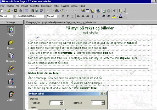 Når man arbejder med tabellen i Frontpage, kan man dog se kanterne som