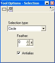så bliver Tools Options aktiv. Vælg: Circle. Feather:0. Sæt et flueben
