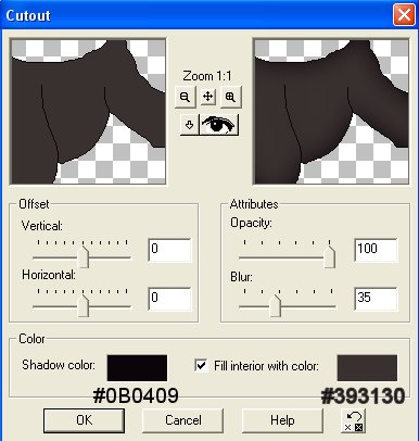 Klik på: Effects / 3D effects / Cut out, samme indstillinger som venstre ben.