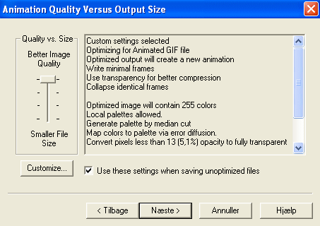 (Jeg ved ikke om indstillingerne under knappen Customize allerede er som vist på de efterfølgende billeder, når man har trukket skyderen helt op for at få den bedste kvalitet)
