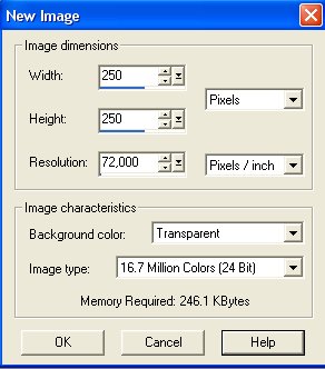 Opret et nyt billede på 250 x 250. Klik på
